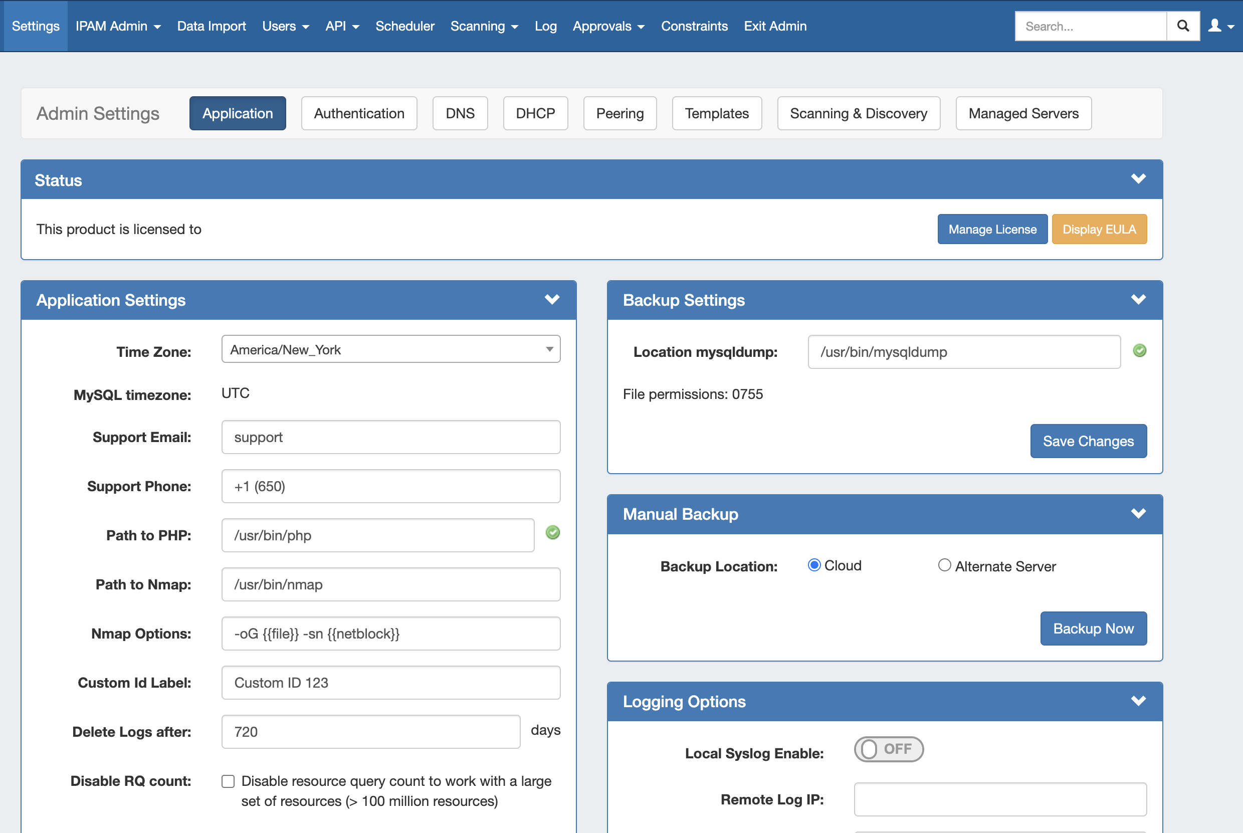 From the Admin Settings page, ensure the "Application" sub-tab is selected, then click "Manage License".
