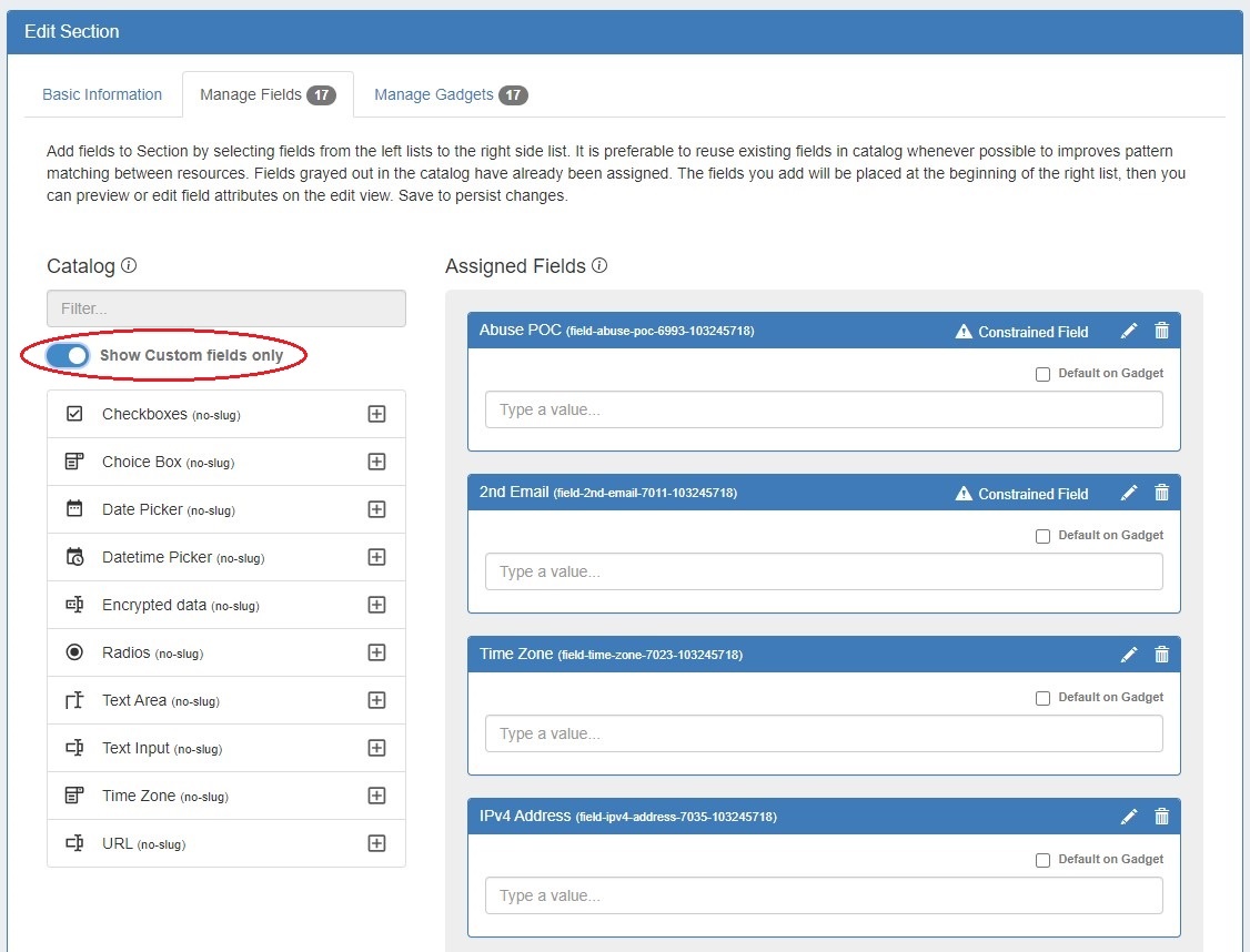 To view only unedited custom fields, enable the toggle below the searchbox. These are fields that do not technically exist yet. Once a blank field is added to a section and customized further (by editing the Field data), it will then have a slug and be added to the Field Catalog for reuse on other sections.