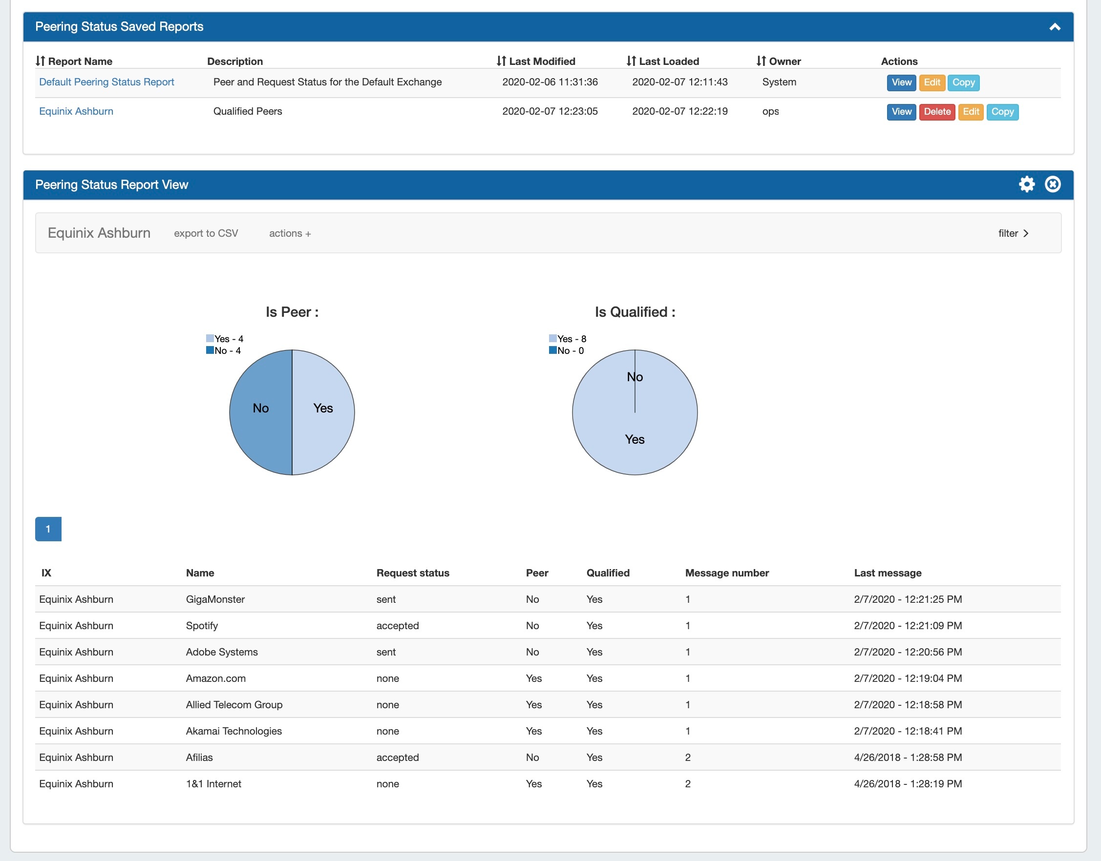 Peering Status reports are set per-exchange, and display pie charts for Peer Status/Qualification Status, as well as a data table of the Peer Name, Request Status, Peer Status, Qualification Status, Message Count, and Last Message Time.