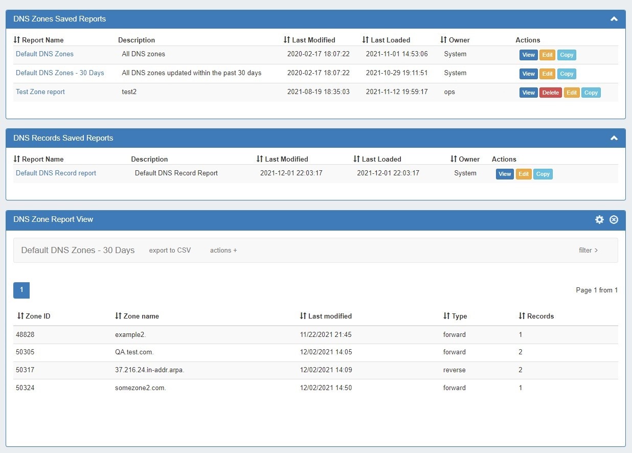 DNS Zone reports provide a list of zones, along with the fields of Zone ID, Name, Last Modified Date, Forward/Reverse Type, and Record Count information. DNS Zone Reports may be exported to .csv (limit: 100,000 records). Default reports include: