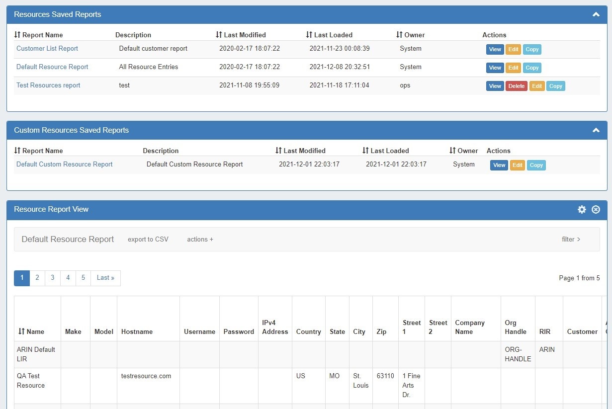 Resource Reports may be exported to .csv (limit: 100,000 records). Default reports include: