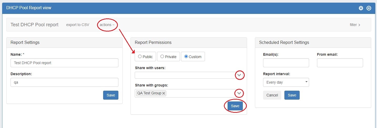 A Report Permissions module is available under report actions, allowing the user to set view permissions to one of the following: