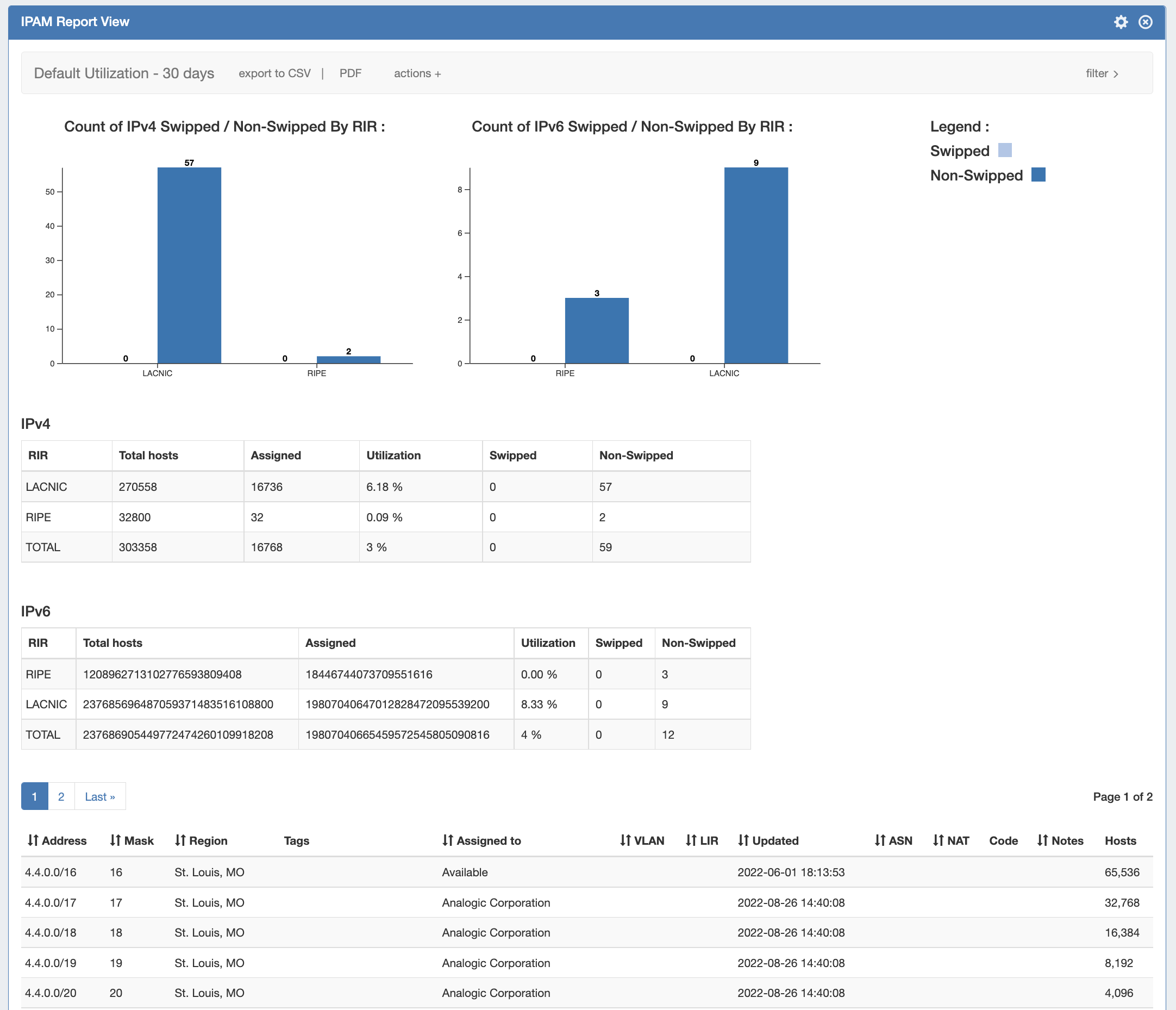 IPAM Utilization reports display IPv4/IPv4 utilization charts organized by RIR and SWIP status, and provide a listing of blocks meeting the applied filter criteria. The report view includes the block data for all applied IPAM Columns, in the order set under IPAM AdminIPAM Columns. IPAM Reports may be exported to .csv (limit: 100,000 records; no chart provided) or PDF (limit: 1000 records; chart included). Default reports include: