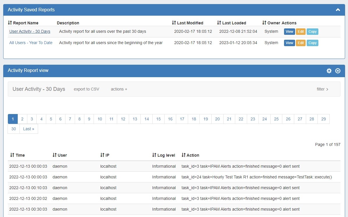 • Default Utilization - 30 days: IPAM utilization report for all aggregates assigned in the past 30 days