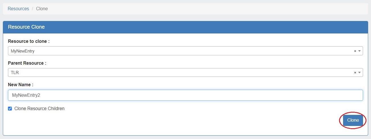 Once on the resource clone page, enter the resource to clone, parent resource, and the new name for the clone. If you wish for all children of that resource (and their children, if applicable) to be cloned, check the "Clone Resource Children" checkbox. When complete, click the "Clone" button.