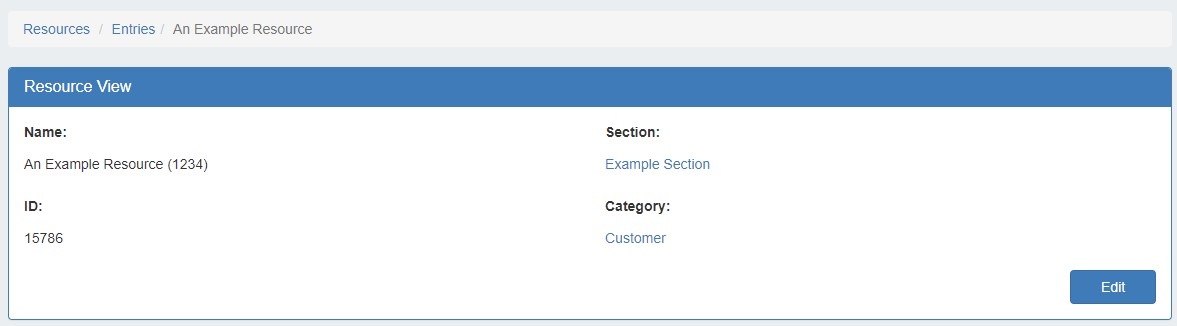 Open the page by clicking on a resource name from the Resource List, or select "View" from the Action Menu for the resource in the Entry List.