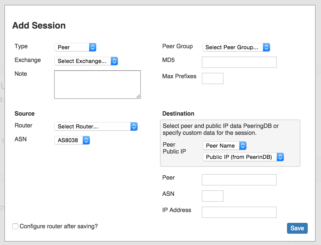 If you would like for the router to be automatically configured when adding your session, check the "Configure Router After Saving" box, then hit "Save". If left unchecked, the session can always be configured later in the Peering Manager.