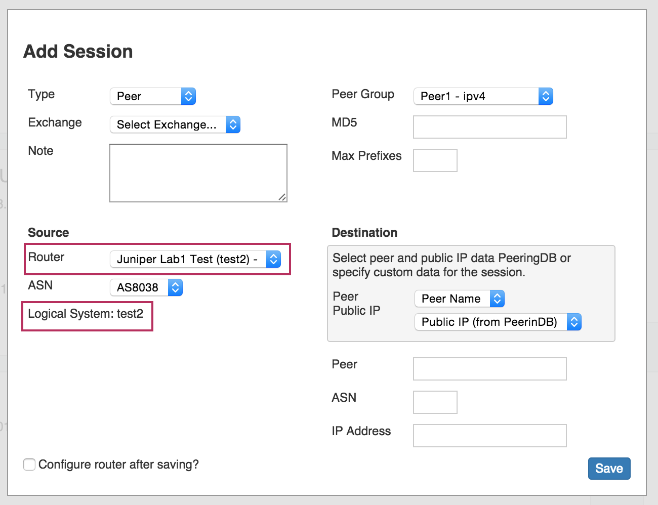 The Peer Group associated with that router / Logical System will automatically be selected. Continue to fill in your session information, then hit "Save".