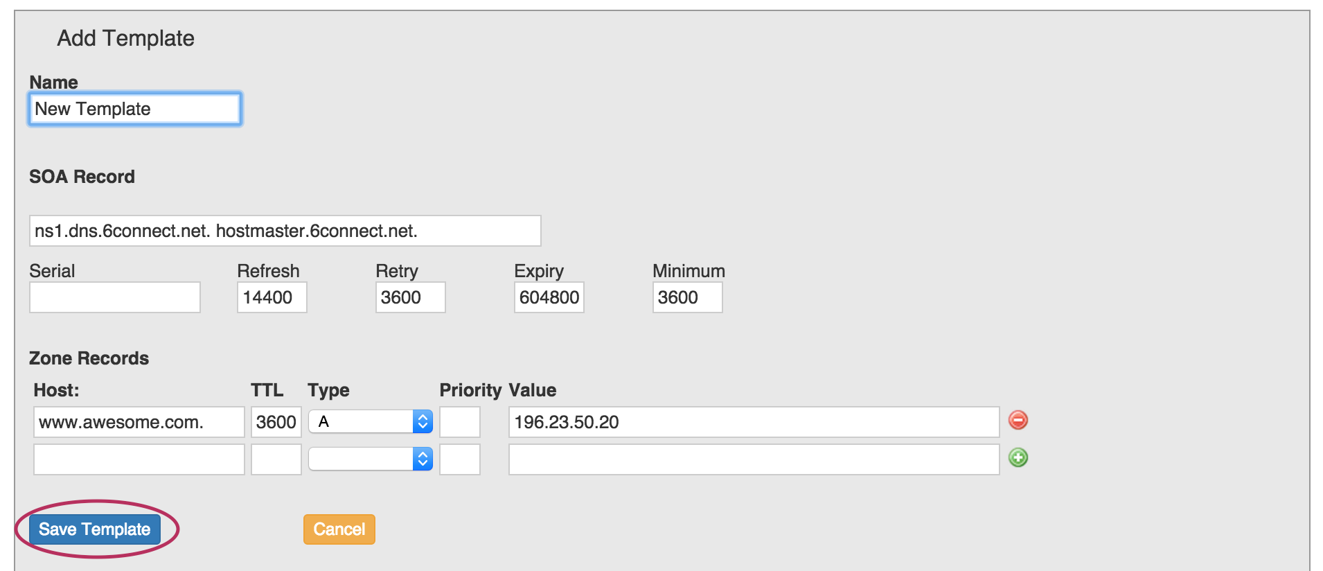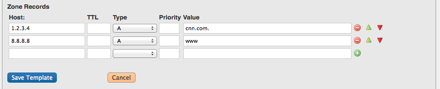 Enter in your new template name, SOA information, and default zone records. When adding records, click the green "plus" icon when adding record information to save your record and add another.