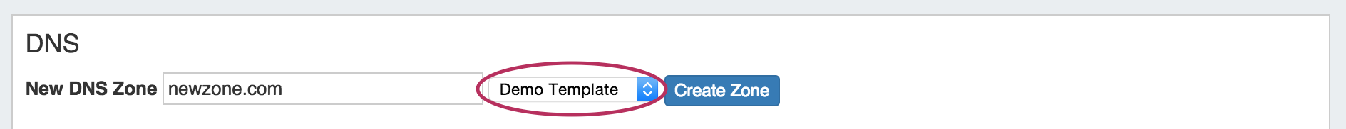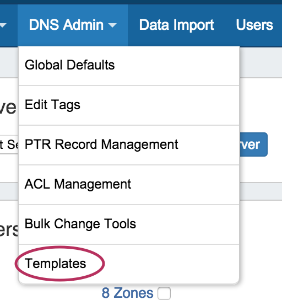 When creating a new DNS zone, the user can specify a zone template to use. Templates are setup from the DNS Admin dropdown menu, under "Templates".