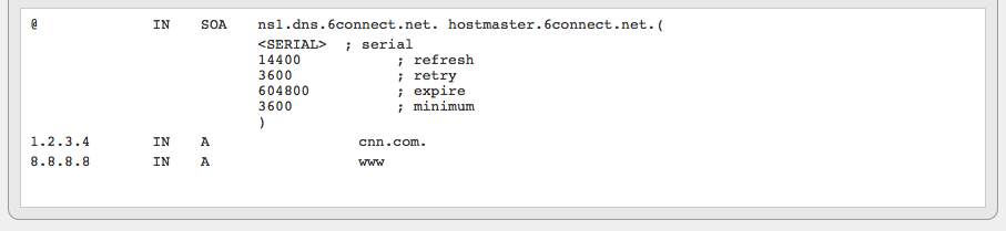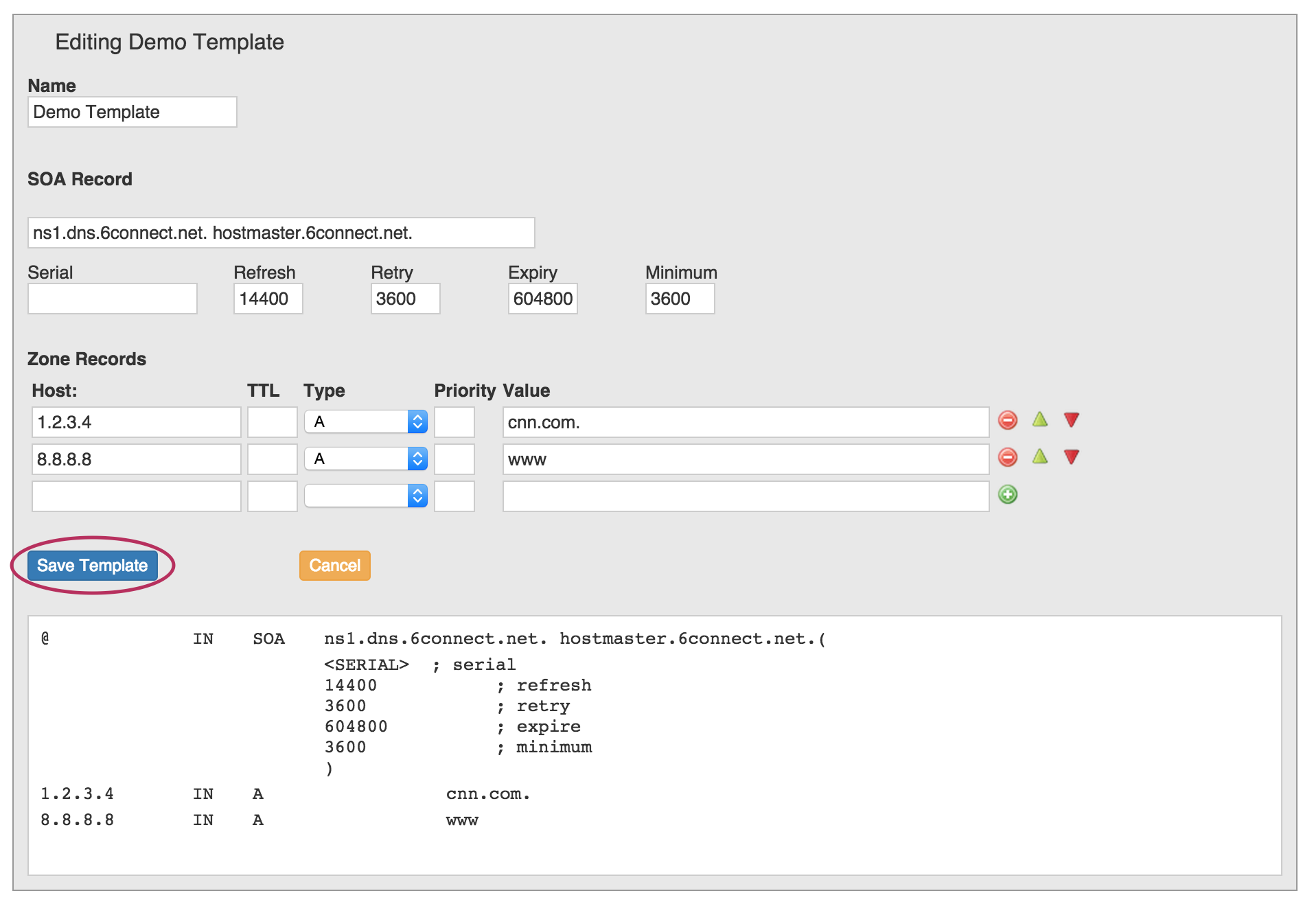 As the admin edits entries in the Template screen, the window below will be updated to show the zone file.