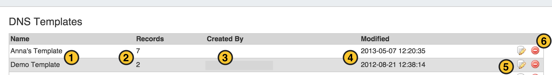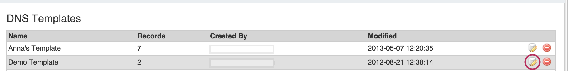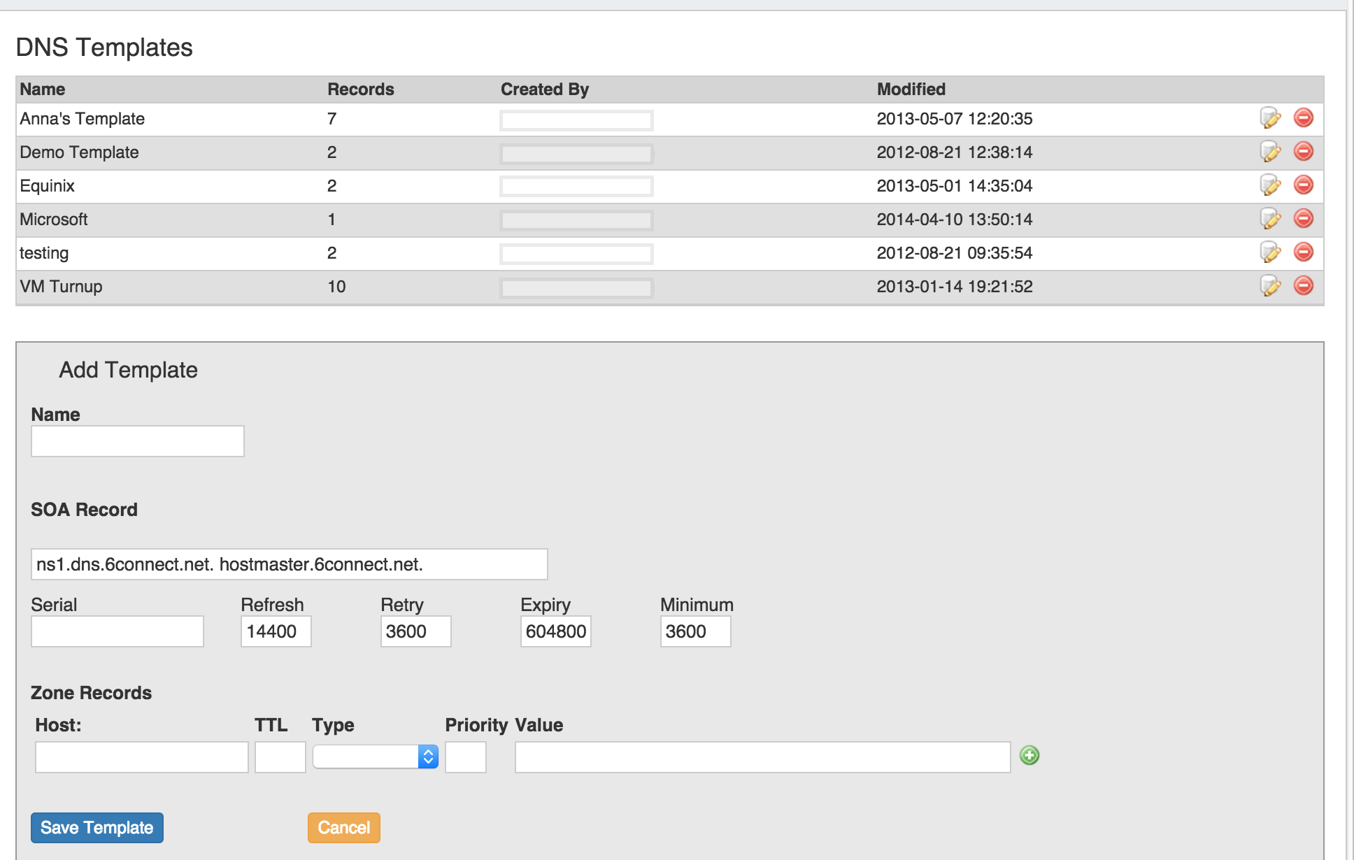 Once on the DNS Templates page, you will see a list of existing DNS Templates, and below that, an area to Add / Edit a template. Unless an existing template has been selected, the template editing area will default to "Add Template" for creating new templates.