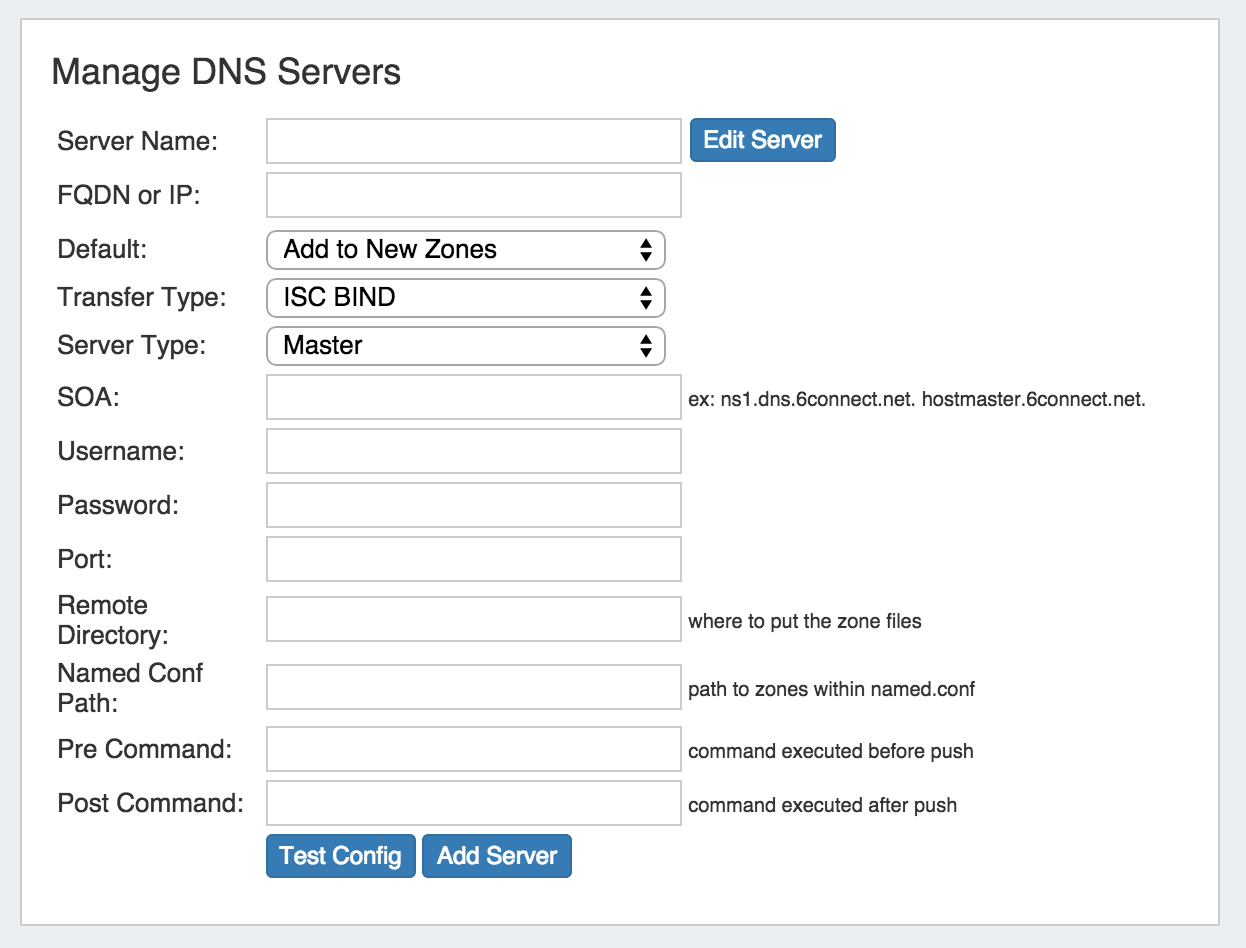 Select "ISC BIND" as the Transfer Type, and fill in the server information fields. For detailed descriptions of the fields, see New Server dialogue section on the DNS Admin page.