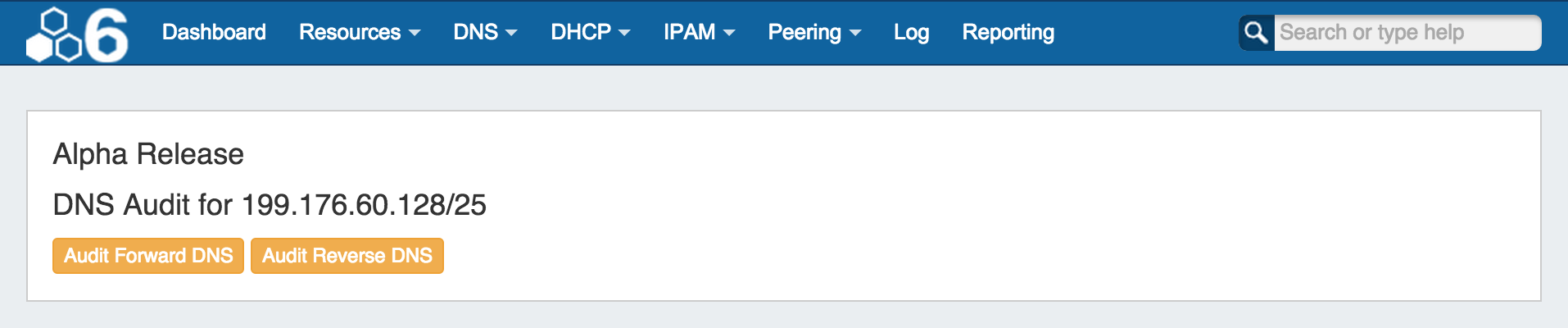 The tool set includes UI, API end points, and a command line interface. The audit results include the DNS as found in the 6connect ProVision database, the results from a resolver, and if there is a conflict in these two pieces of information.