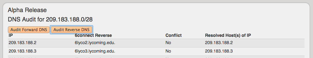 2) From there, select the "Audit Forward DNS" or "Audit Reverse DNS" buttons to provide a list of IPs, the Reverse Values, Conflict Status, and Resolved Host(s).