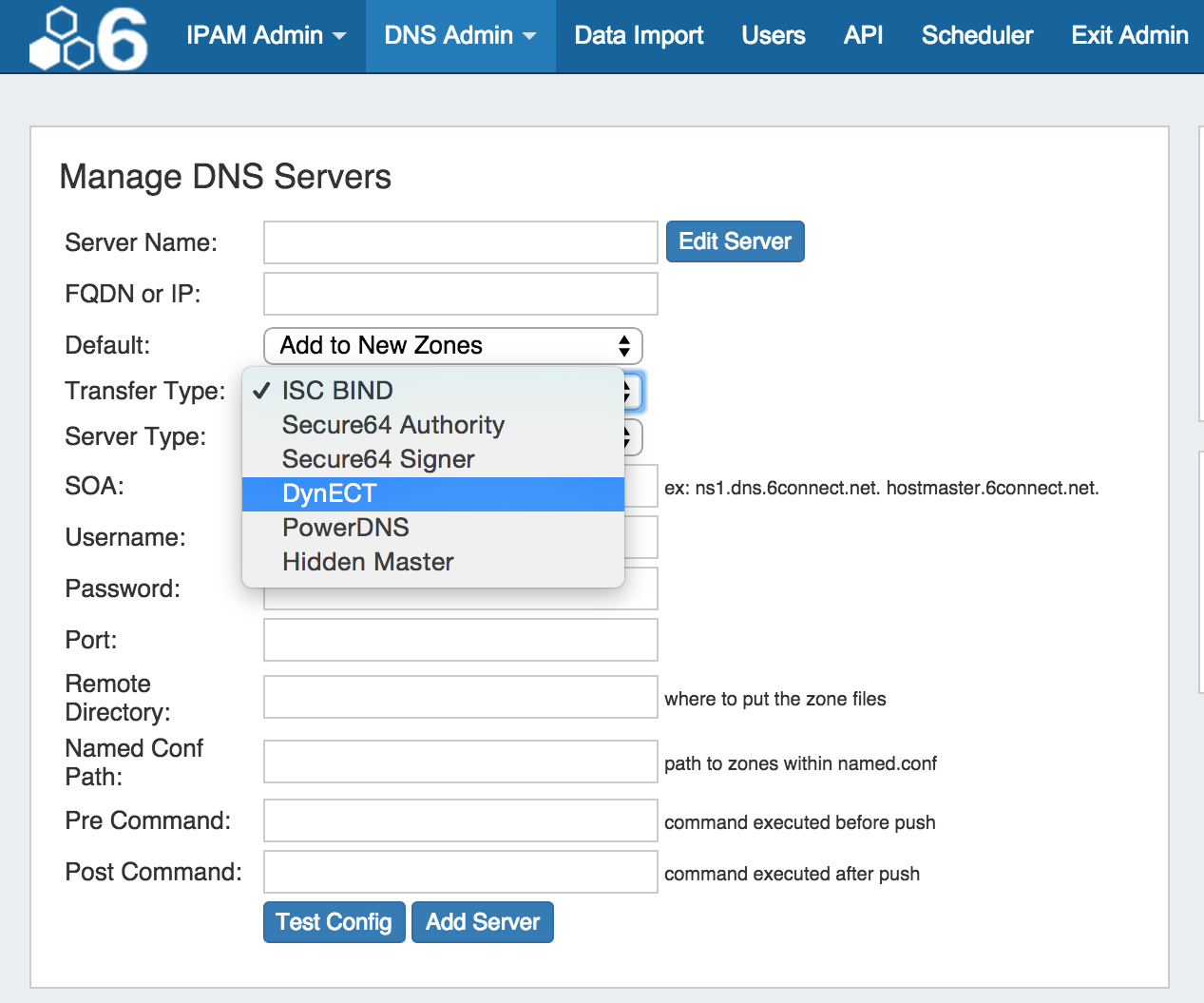 To import DynECT zones, first ensure the DynECT server has been set up under DNS Admin - Manage DNS Servers and configuring a DynECT server.