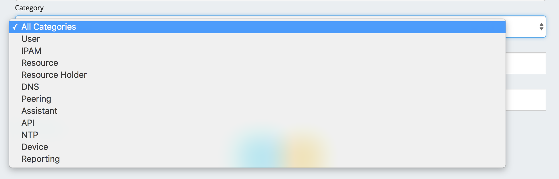 Category: Under the "Category" dropdown box, select "All Categories", "User", "IPAM", "Resource", "Resource Holder", "DNS", "Peering", "Assistant", "API", "NTP", "Device", or "Reporting".