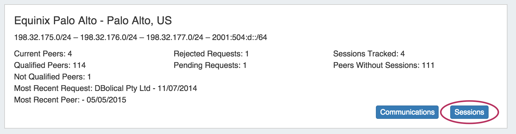 To bring up the Peering Manager, click on "Sessions" for the desired exchange in the Peering tab.