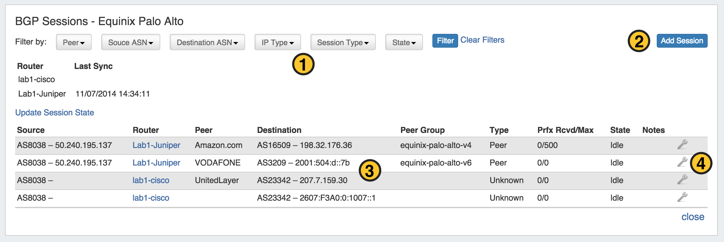 1) Filter Options: The sessions list may be filtered by Peer, Source ASN, Destination ASN, IP Type, Session Type, or State. Once you've chosen the filter criteria, click on "Filter". Select "Clear Filters" to return to the full session list.