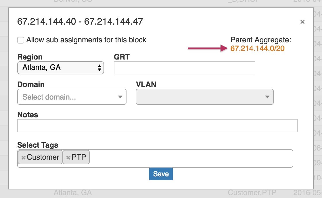 CFR / IM-2398: A link to the parent aggregate has been added to the IPAM Gadget -> Edit block module. This link takes the user directly to IPAM Manage for the aggregate.