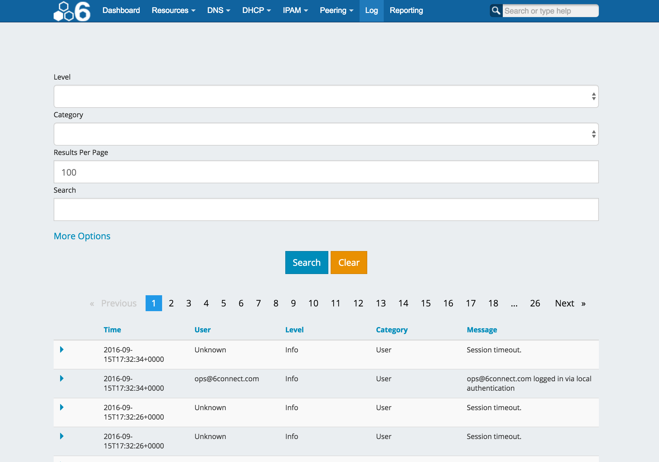 The Log Gadget provides detailed information on actions performed in ProVision. Actions may be filtered by Level, Category, Log ID, User, and Time (specific or a range), as well as results-per-page option set. Additional filtering options allow targeting of specific log entries.
