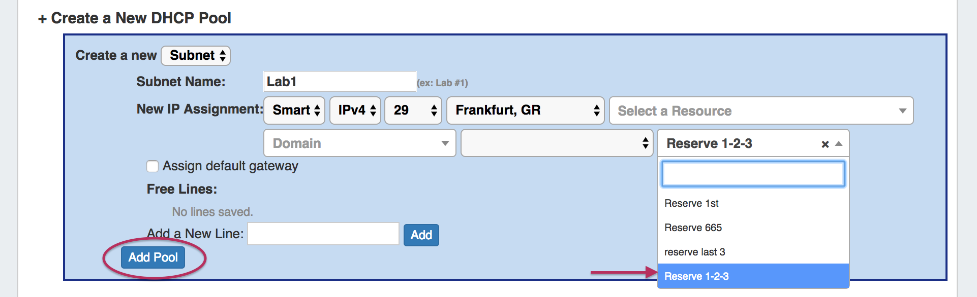 For Smart Assign DHCP Pool creation, existing IPAM Rules may be applied to reserve additional addresses out of the pool range. To create an IPAM Rule, see IPAM Rules.