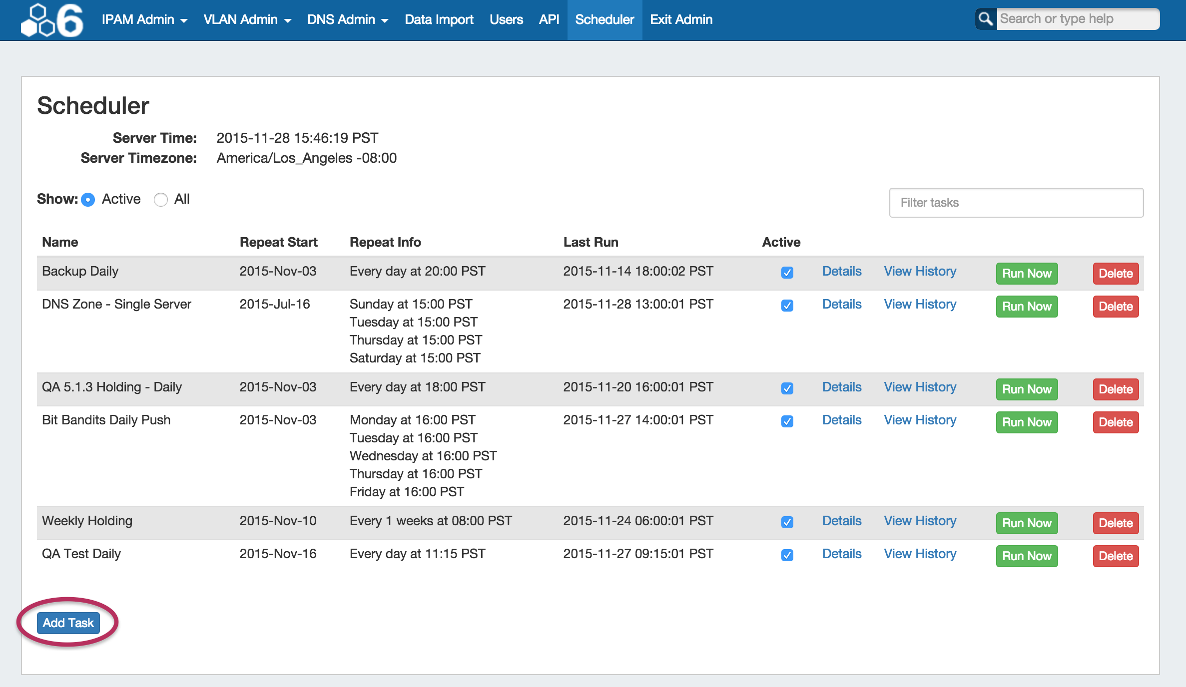 From the task list itself, you can enable/disable tasks, view details, view history, run tasks, and delete tasks.