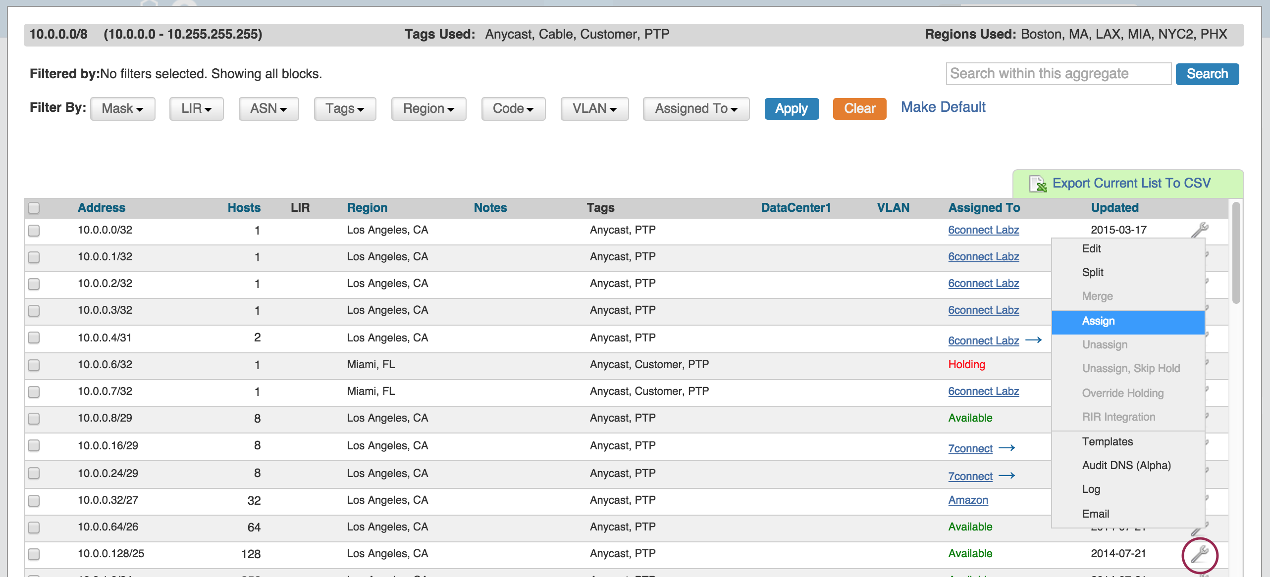 You can also assign blocks manually using the "Assign" function from the IPAM Manager screen (accessible from the IPAM Tab). Click the Action Menu (wrench icon), then select "Assign".