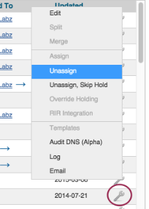 To unassign the block, simply click on the Action Menu (wrench icon) for the block and select "Unassign". You may also chose "Unassign, Skip Hold", which unassigns the block and immediately returns it to available, bypassing the holding tank. After unassigning blocks / overriding holding, newly available blocks will be merged upon next page refresh.