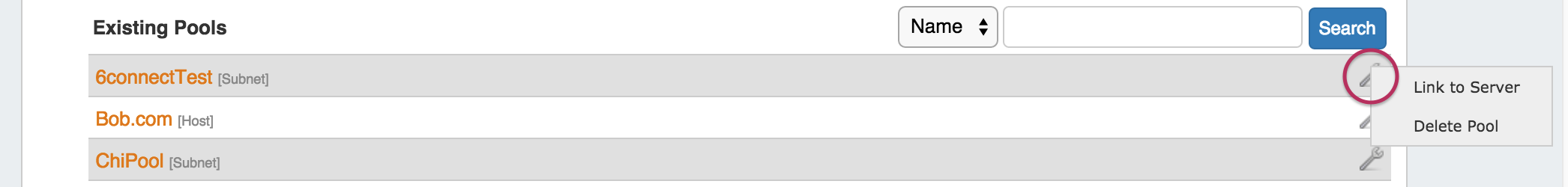 Both Linked and Existing DHCP pools have field-specific search options to filter the DHCP pool list(s). Select the search term type from the dropdown list, type the search term in the search box, then hit "Search".