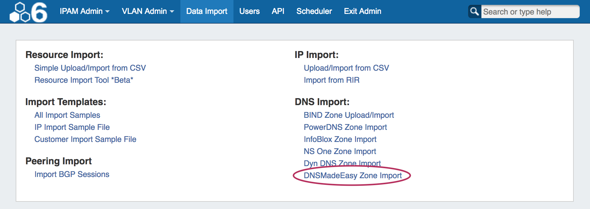 Once server setup has been verified, navigate to the Data Import Tab in the Admin section. Select the "DNSMadeEasy Zone Import" link.