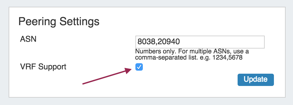 Once VRFs are set up for a router, the source ASNs for the associated VRFs will appear in the Source ASN dropdown when adding or editing a session for that router from the Peering tab.