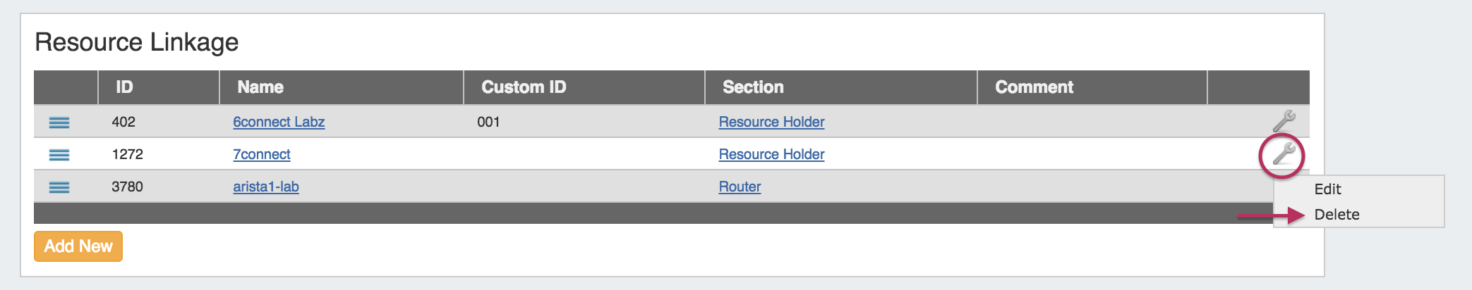 To delete a Resource Link, click the Action Menu (wrench icon) for the desired link in the list, then select "Delete" from the menu.