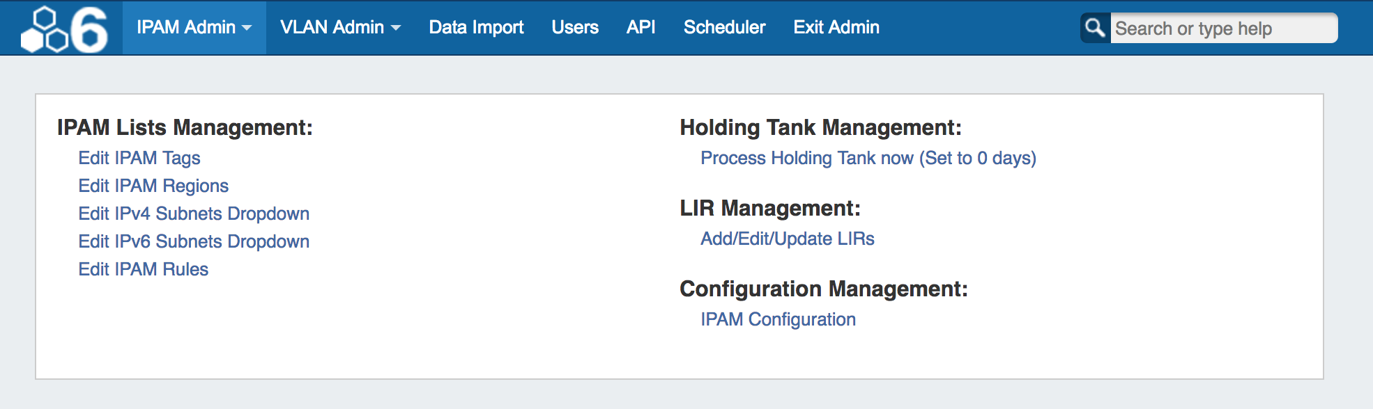 IPAM Administration is accessed through the Admin area of ProVision. It includes sections to manage IPAM Lists, the Holding Tank, LIR, and IPAM Configuration.