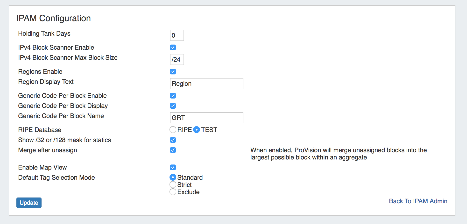 Regions Enable: Check the box to enable "Region" tags for IP blocks. This will add a "Region" column to the IPAM Manage screen. Values may be set from "Edit IPAM Regions" under IPAM Admin - IPAM Lists Management.