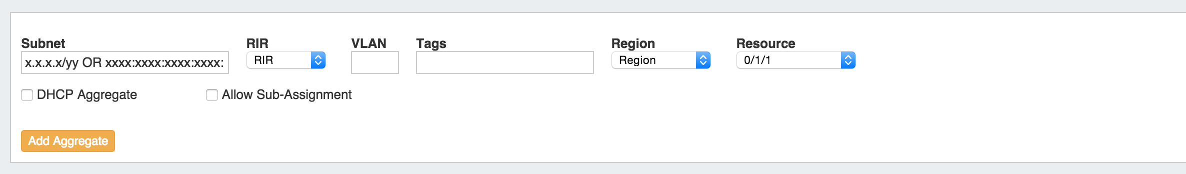 Opens a menu to add an aggregate block with options for RIR, VLAN, Tags, Region, Resource, and enabling Sub-Assignments / DHCP Aggregate.