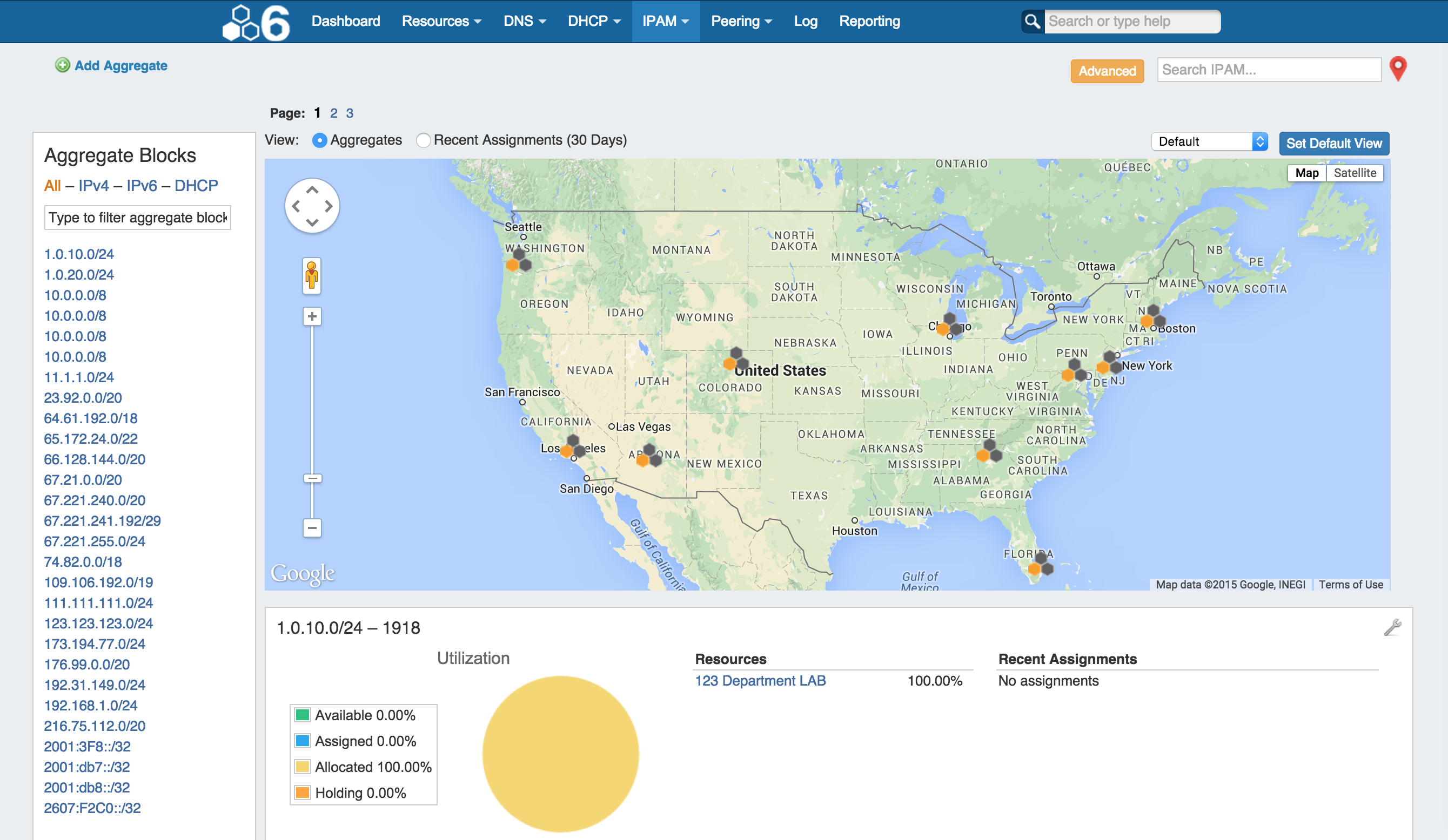 Map View will show aggregate locations / recent assignments in geographical format, based on regions assigned to those aggregates. Clicking on a location icon will bring up a current utilization graph and a link to that aggregate's IPAM Manage page if in Aggregates view, or assignment details if in Recent Assignments view. A default map view may be set by either selecting a predefined map area from the dropdown (US, US & Europe, South America, All), and clicking on "Set Default View", or a custom area set by zooming / navigating to the desired map area and clicking "Set Default View".