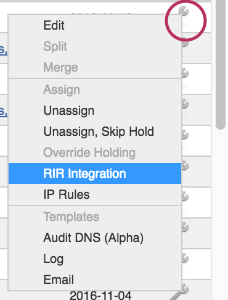 Once these have been configured, you will be able to use the RIR integration feature from the Action Menu on the IPAM Manage screen or IPAM Gadget: