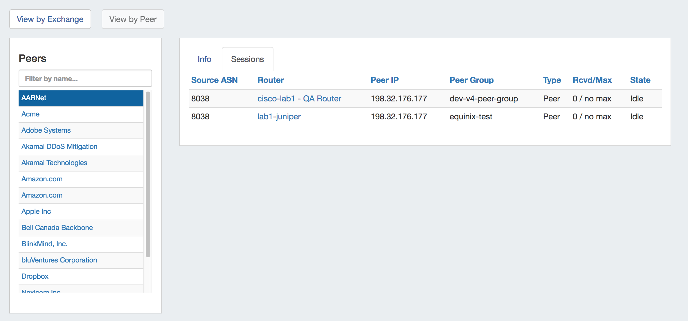 Two "Views" are available for the Peering Tab: "View by Exchange", and "View by Peer". The view may be changed by clicking on the "View by ..." buttons at the top left corner of the page.