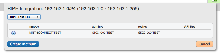 Identify which LIR data you want to use for the netnum update, and select either "Create Inetnum" or "Cancel" to exit.