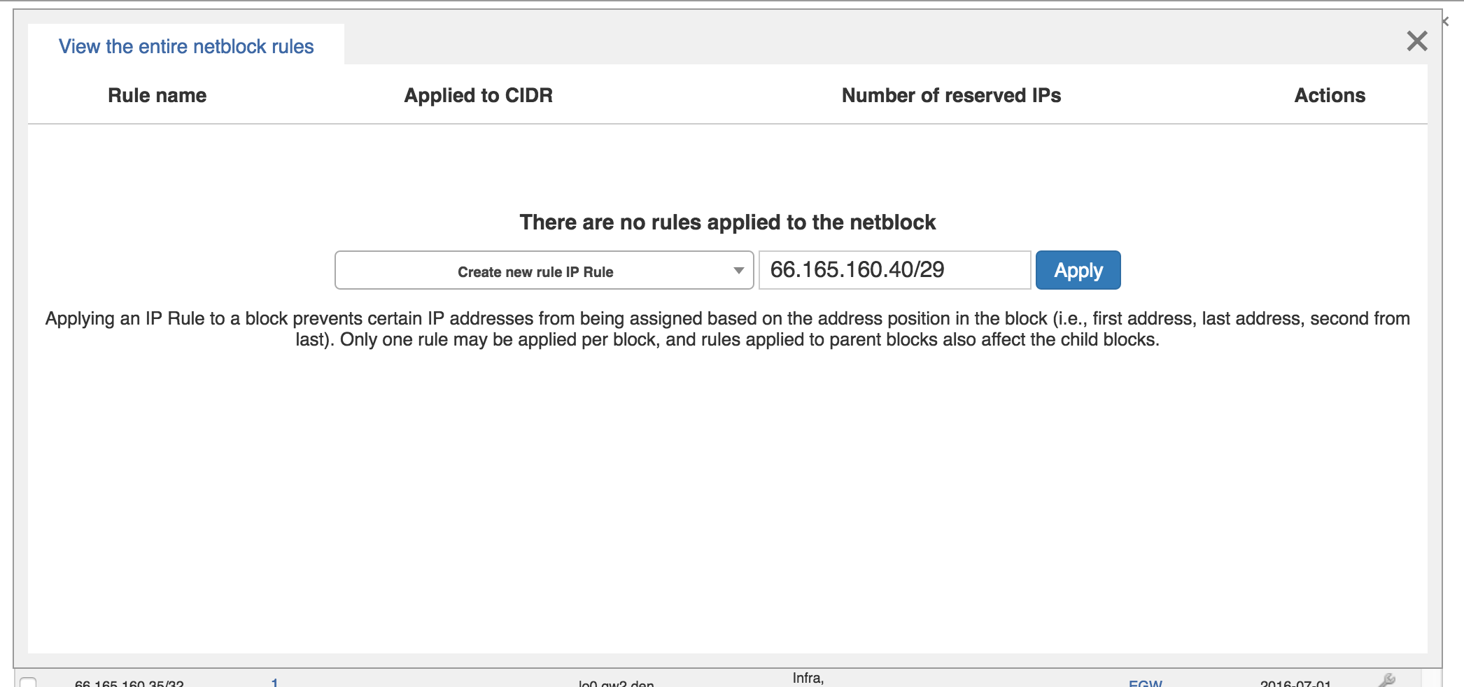 The IP Rules screen will pop up. From here, you can view existing rules applied to the block (or the parent block), apply an existing rule, or create a new IP Rule.