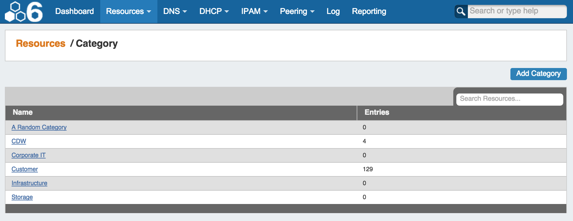 The Resource is an entity that users can assign Network Resources to (IP blocks, hosts, DNS zones, etc.). You can also create hierarchies between resources which allows you to leverage permissions to control who can view and interact with any given resource and its assigned elements. Please note that you can also have Resources that do NOT have anything assigned to them regarding Network Resources. The result of this flexible architecture is that you can work with Resources in three ways: