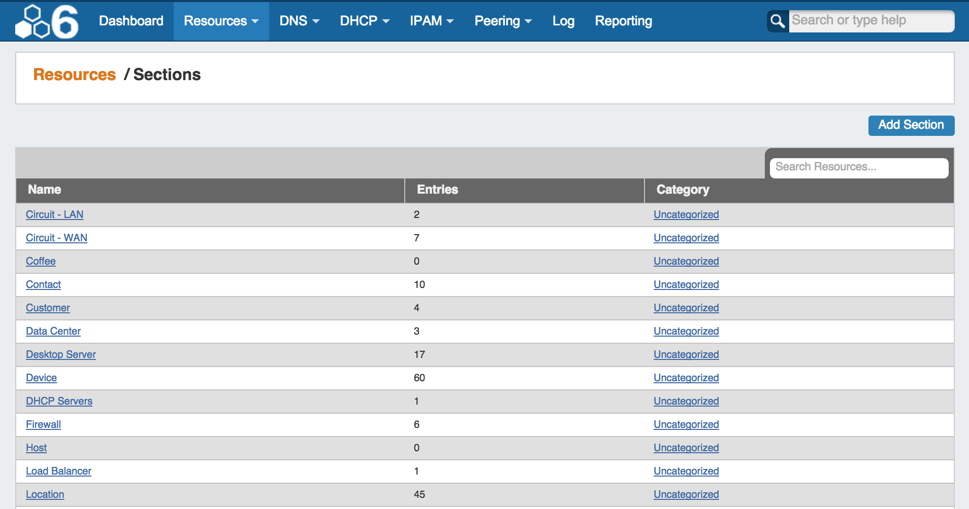 • Resource Categories: Categories can be used to create some filtered views for given Resources and Sections. For example, you can create a Section called "Resource Holder" and then assign a Category "Customer". Then you can view a list of Resources that have been assigned to Category "Customer". In the same way, you could also assign a Section called "Router" under the Parent Resource "Corporate Datacenter" and then assign a Category "Infrastructure".