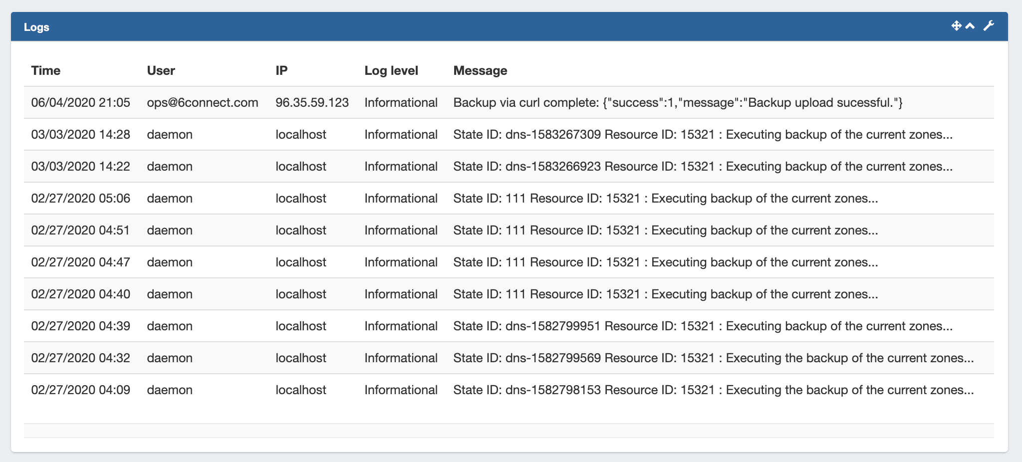 The Logs Dashboard Widget displays the most recent 'x' number of logs for a specified search term, such as resource name, task, id number, username, and so forth.