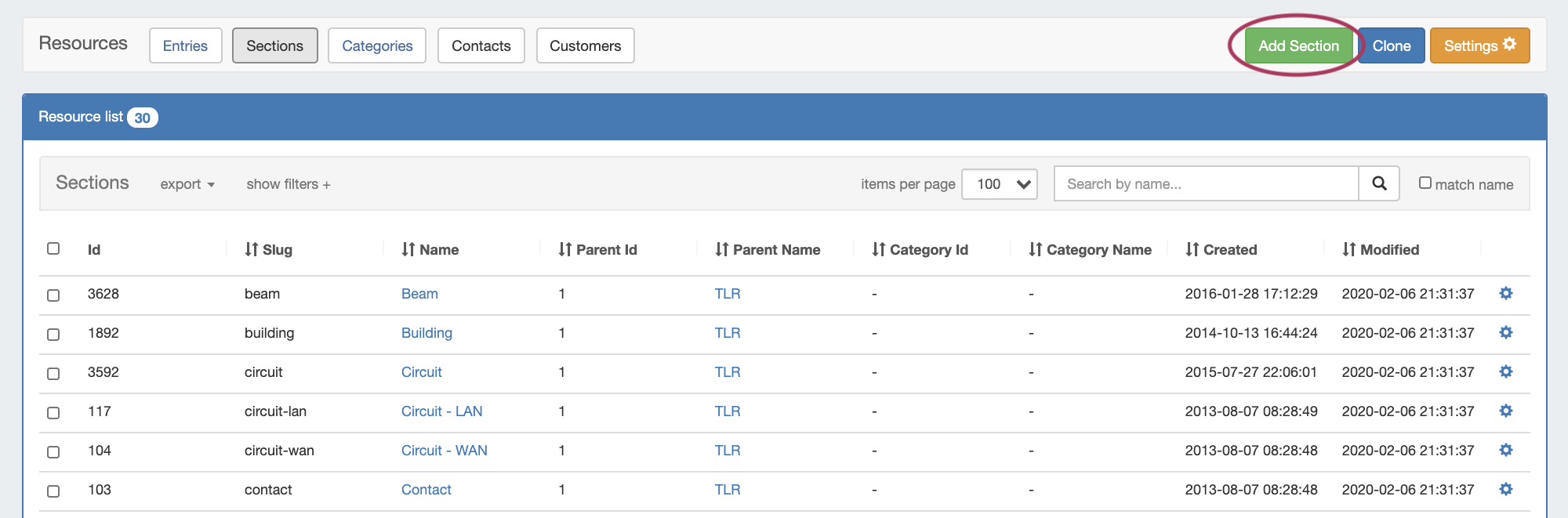 Create a new section by specifying a name and category. Then hit the "Create" button.
