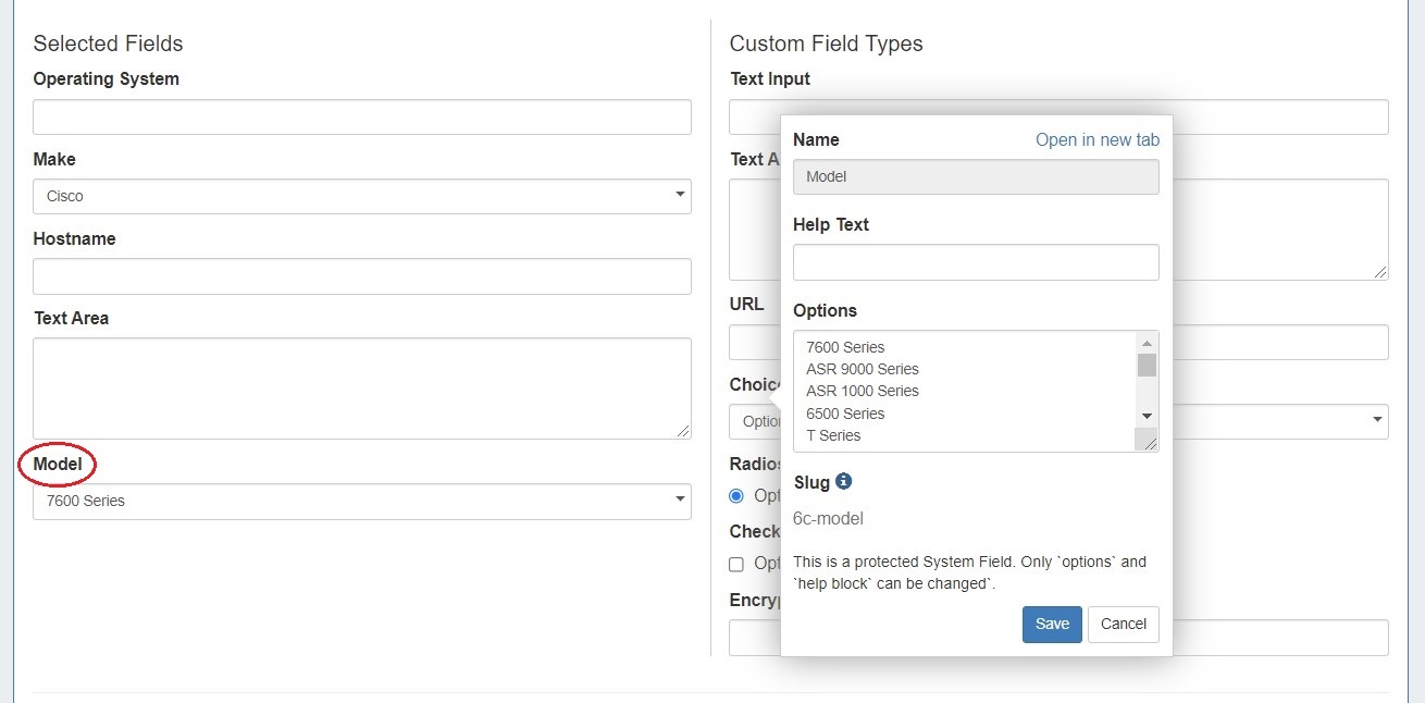 Select the field name and you will get an editing window to modify the parameters of the field. Custom fields may be renamed and have other attributes updated, whereas protected system fields may have noted restrictions.