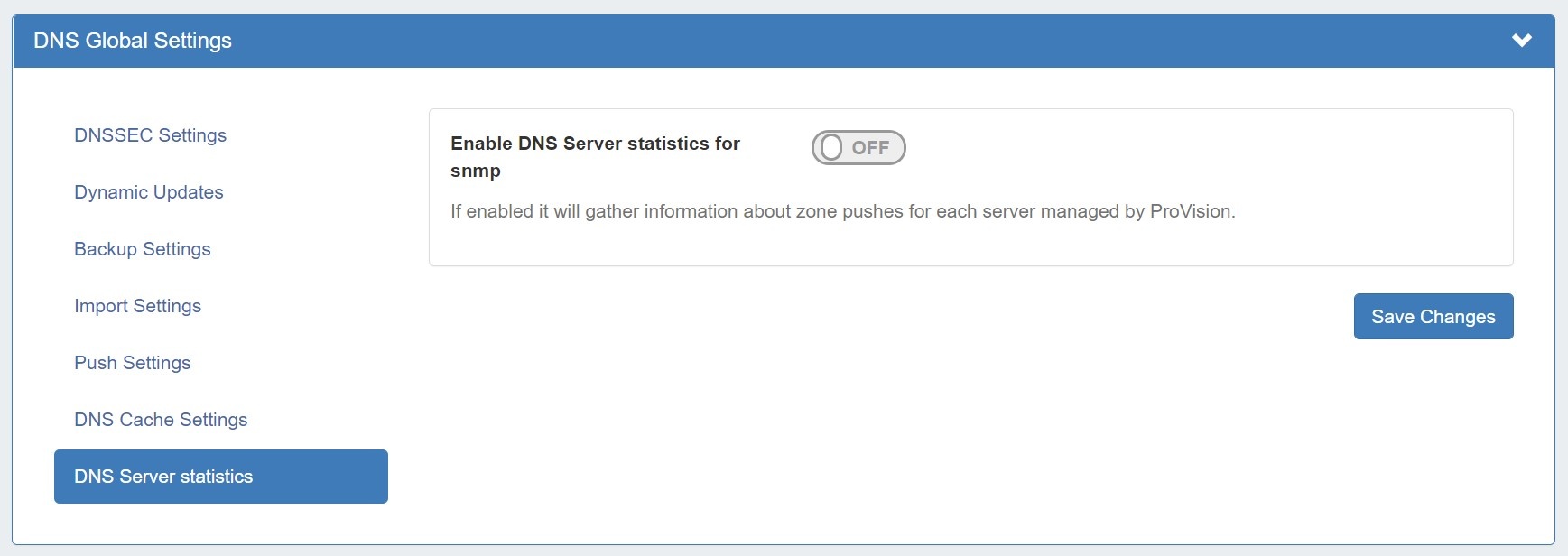 Enable DNS Server statistics for snmp: Toggle to "on" and it will gather information about zone pushes for each server.