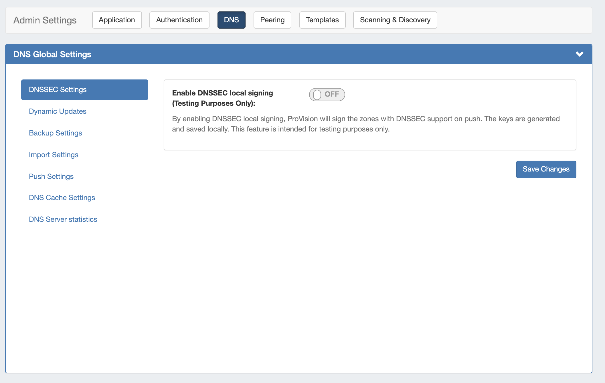 DNS Settings are accessed by clicking the "DNS" sub-tab at the top of the Admin Settings page. DNS Settings are used to support various DNS functions, including DNSSEC, Dynamic updates, backup settings, push settings, DNS cache settings, and DNS server statistics.