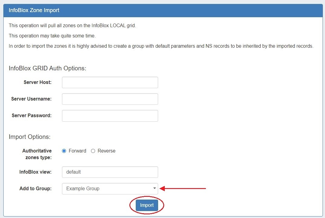 It is recommended to have a DNS Group created in advance with the proper default parameters and records to be inherited by the imported InfoBlox zones and records.