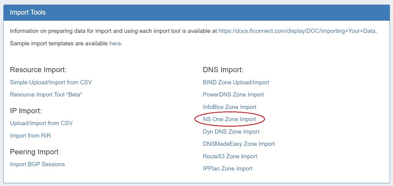 Once server setup has been verified, navigate to the Data Import Tab in the Admin section. Select the "NS One Zone Import" link.